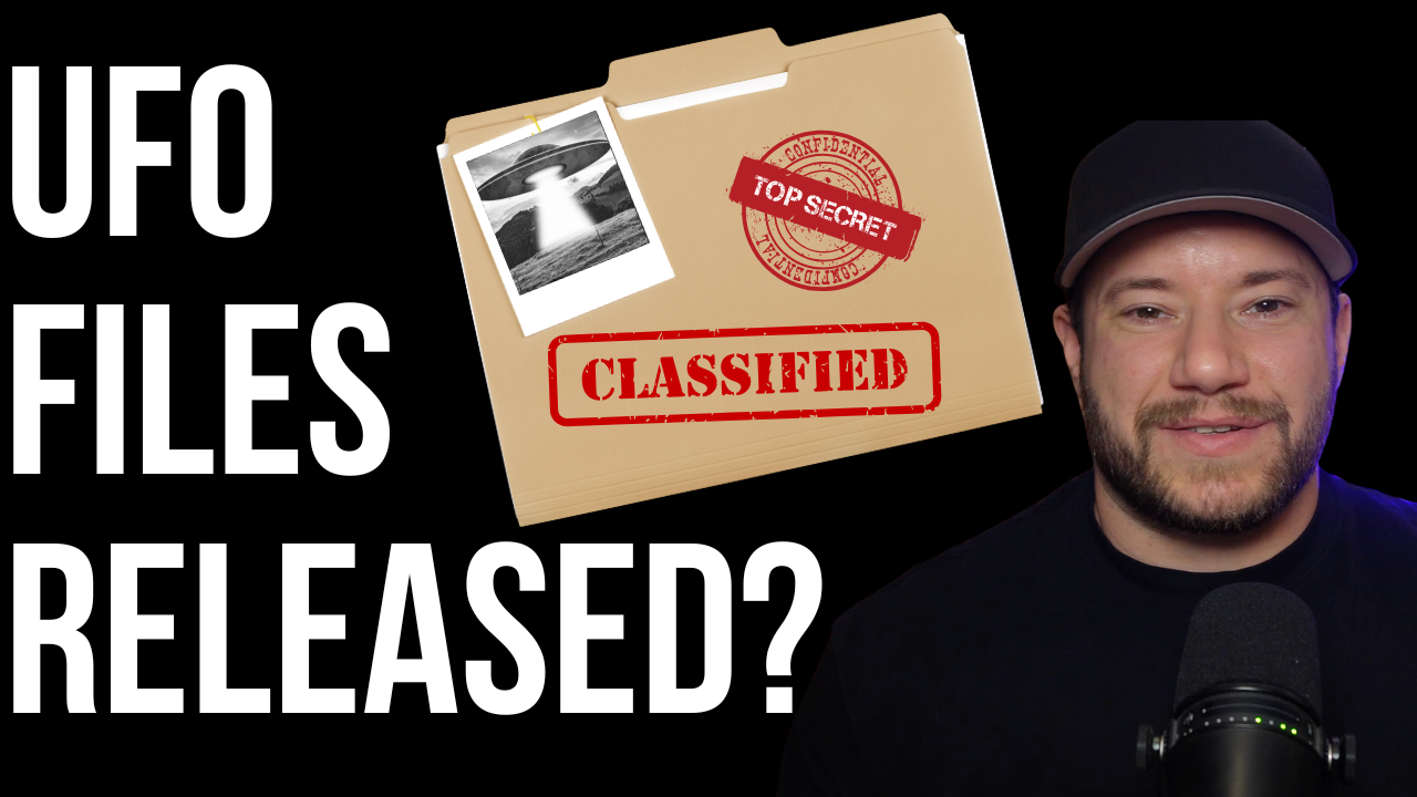 UFO files released thumbnail with classified top secret folder, flying saucer photo, and podcast host discussing government UFO disclosure